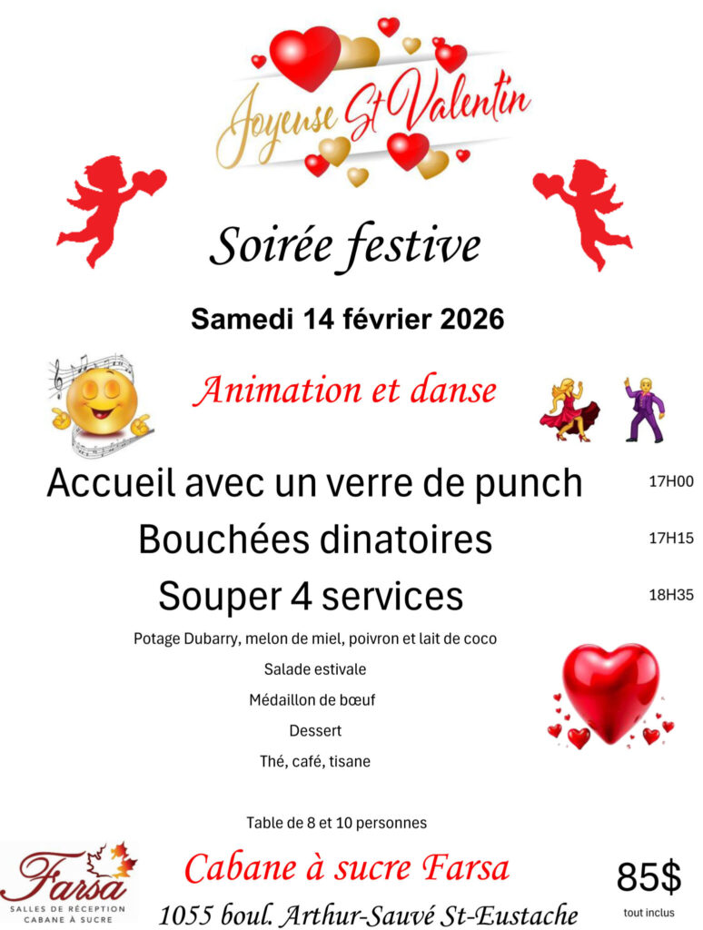 « Tous les Évènements Soirée Saint Valentin 14 février 2026 14 février @ 5:00 pm - 11:00 pm 85$ « LES SAVEURS DU SAVOIR Ajouter au calendrier Google Agenda iCalendar Outlook 365 Outlook Live Détails Date : 14 février Heure : 5:00 pm - 11:00 pm Prix : 85$ Catégorie d’Évènement: Souper spectacle Site : www.farsa.ca Lieu Salle de réception Farsa 1050 Arthur-Sauvé Saint-Eustache, Québec J7R 4K3 Canada + Google Map Téléphone 450 473-3840 Catégories SouperSouper spectacle